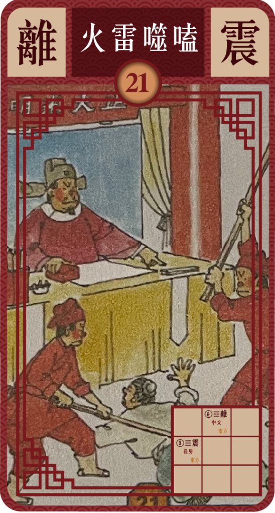 頤中有物,日噬嗑噬嗑而享,則柔分,動而明,雷電合而章柔得中而上行,雖不當位,利用獄也。有如上下齒間有物橫便者,必須咬斷,衝破困難,才為通亨之象。上卦代表對方或事象,「離」有火,目標之象; 下卦代表自己,「震」有雷動,決斷之象,往目標前進時阻礙物很多,只要耐著性子如同咀啊一般,可以消除掉,可是自己的決斷及即時行動才能排除障礙,同時在排除的過程中會有激烈的爭執,奮門靜扎,才能於消除後歸於太平,亦就是威而有明,使無所梗而合於道,進而執法用威,一掃陰置之象。處事先掌握重點再以剛柔並濟明快有力方法。