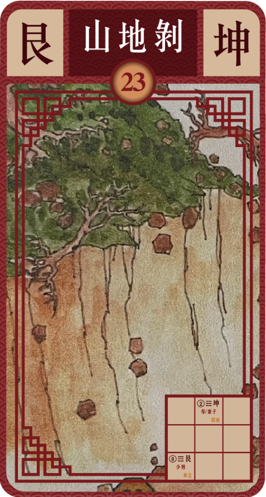 「剝,不利有的往,小人長也。順而止之。」卦象陰長而陽消,象徵小人的陰交有五陽爻只有一,表示小人極盛,而君子不敢有所作為,時運受陰象破減,顯得運衰,上卦代表對方或事象,「良」有山,阻隔之象,下卦代表自己,「坤」有大地柔順之象。此卦顯示山無聲無息的層層剝落在大地上這現象告訴自己危機將無聲無息的落在自己身上,要留心被詐,或有不利災禍危機四伏,自己要順應時勢,停止行動,謀求根本上的挽救,因氣運已衰到極點。