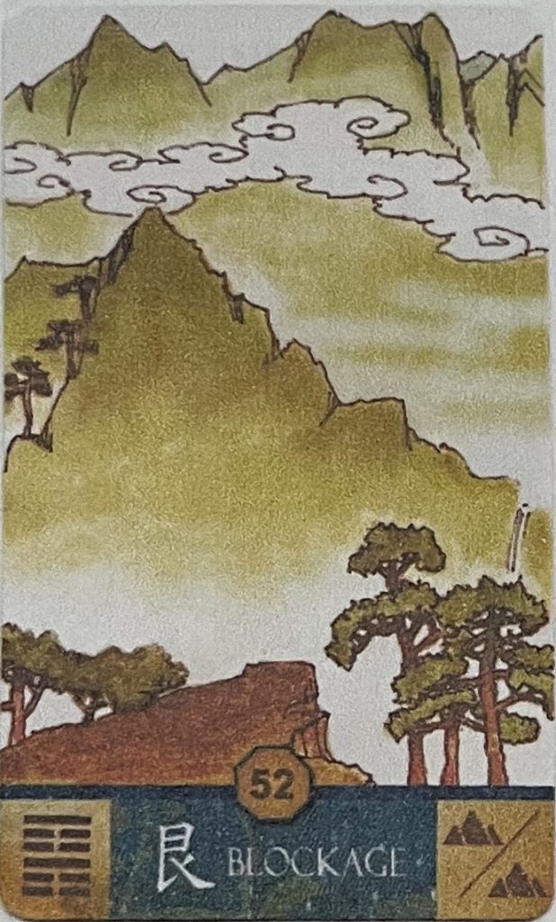 上卦代表對方或事象,「艮」有山及阻止之象,而下卦是自己亦 為「艮」,有不動及猶豫之象,「艮為山」卦中,陽爻在上卦及下卦之最上爻,亦表示無法再前進之意,自己想再前進受阻於 外界阻礙,所以要有如不動之氣度,不受事象干擾影響,亦就當動靜不失其時,必得光明,因不逆勢而為,就不會遭到打擊,此時,硬要前進,必不得貴人相助。問事得到艮為山卦, 又無變動爻時表示所問的事情尚未開始或剛結束,轉變關鐽點。