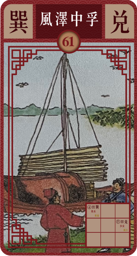 代表對方或事象的上卦巽卦有風、順從、柔和之象,下卦為自己是兌卦有愉悅,開口池澤之象,展現為風自水面吹過,而水面起波浪,為起配合共鳴之象,同時在上下中卦中的九二及九五四爻為陽爻在每卦中間位,表示內心信守及實在,在中孚卦中的三、四兩爻為陰爻,其他各爻為陽爻,亦表示中心為虛心以誠相待之象,另外上卦巽為順從下卦為兌有喜悅之象,表示彼此都心悅誠服,以互信為基楚共同往目標邁進。因內有信實加上至情至性,可感人天化頑強。